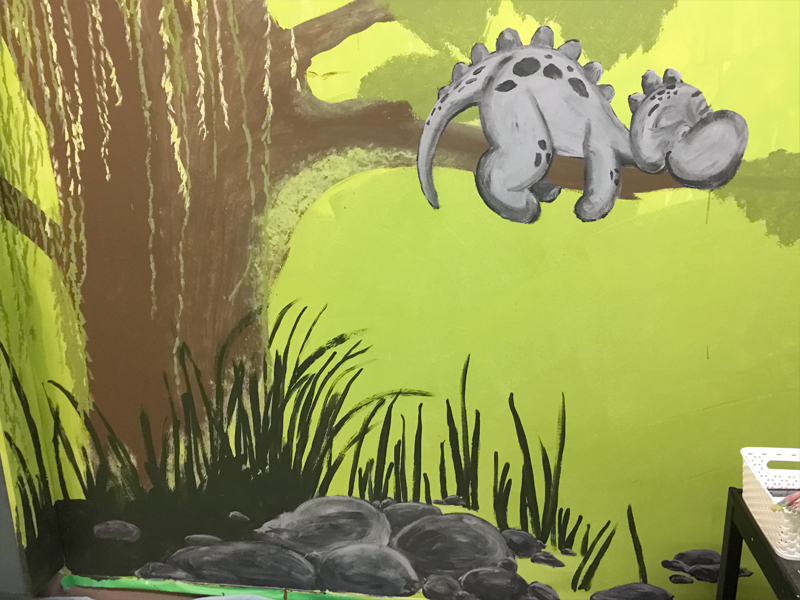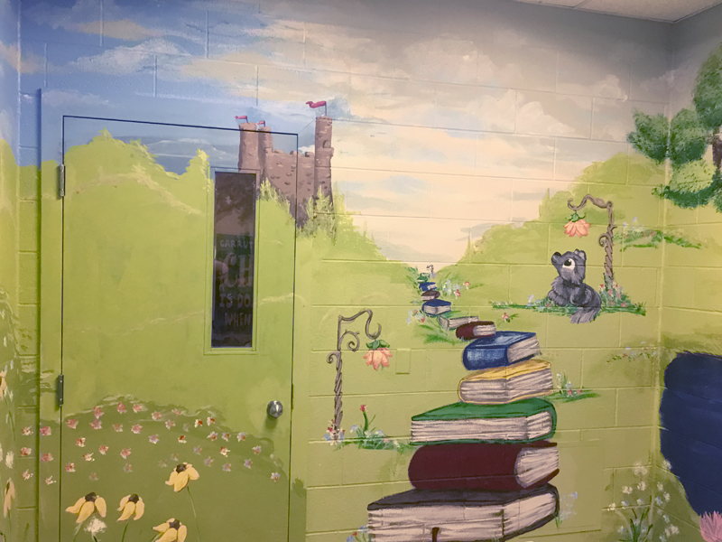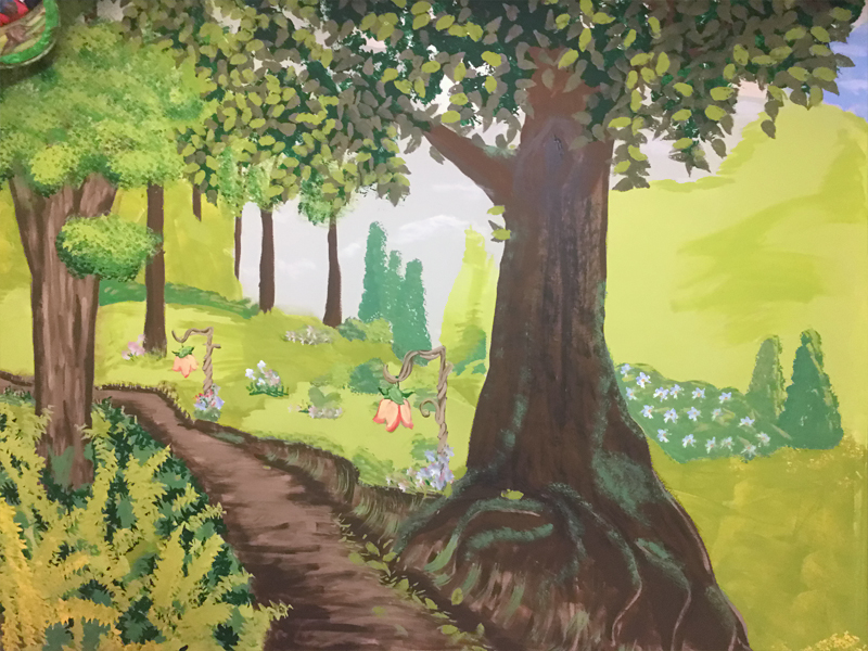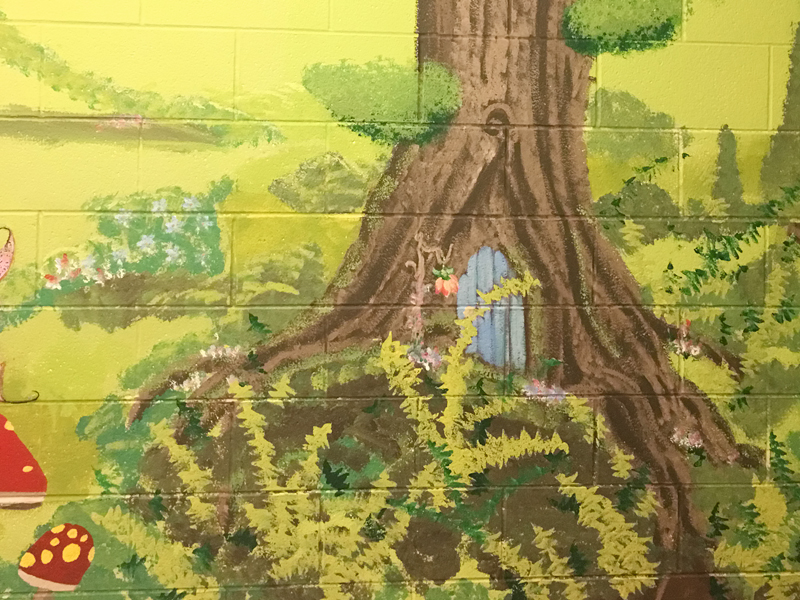 I worked with another muralist to complete this complete room within a week that we had access to the school. The SERT was looking for a calm, relaxing retreat for the kids and a fantasy forest theme was chosen