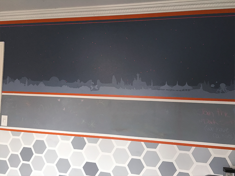 A full room re-design for a 7 year old boy. He wanted a Star Wars theme and we decided to paint the lower walls in a repeating hex pattern and then outline scenes from all the star wars movies aound then top. The middle band is chalkboard paint